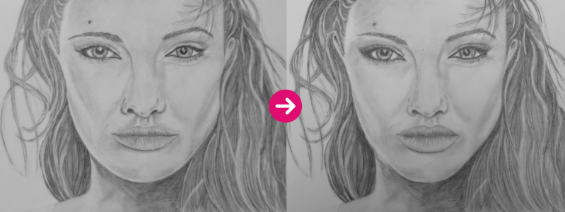 Az itt látható Angelina Jolie portré a Mentorprogram tananyagának elején található, így ez a portré tanulóink legelső rajzai közé tartozik, ezért egy ehhez kapcsolódó példát mutatunk be lentebb, hogy látható legyen, milyen fontos a mentori segítség, főként a kezdetekben!
