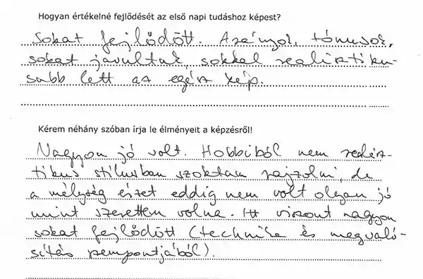 Köszönettel tartozom az oktatónak, nagyon sokat tanultam, megszerettem a rajzolást és minden nap sikerélménnyel mentem haza.